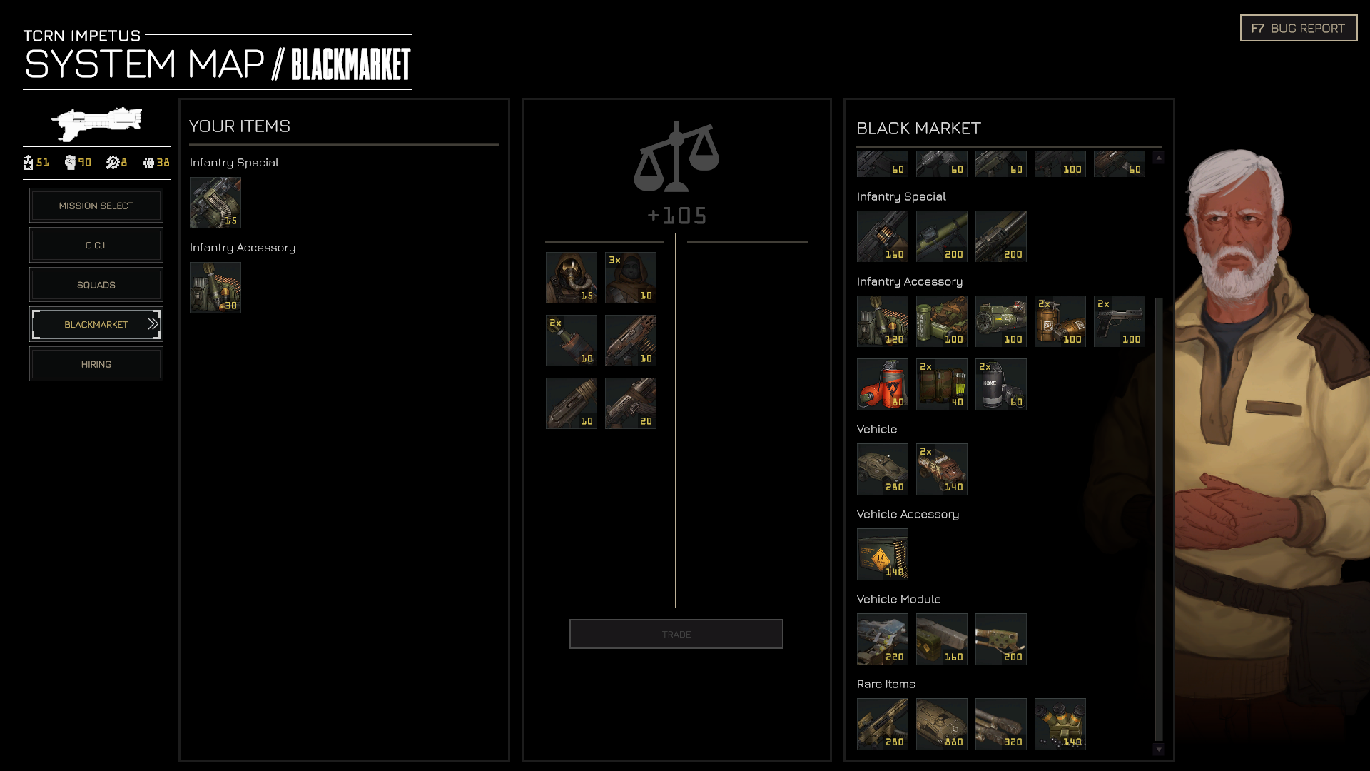 However, what Menace struggles to capture aesthetically, it more than captures mechanically. Through innumerable small potential losses, Menace crafts a tactical world that is equally thrilling and threatening. Even at the start, you have too few resources. You enter the Wayback with a flagship so damaged that it only has a functioning, but damaged, med bay. You choose four starting squads and have to recruit many more out in the field. You are shipped out with only standard equipment and must buy everything else from the black market. You get a tangible sense that this mission is just a rounding error in the core worlds’ spreadsheets. They don’t particularly care if you succeed. They are certainly not doing what they could to prevent your failure.