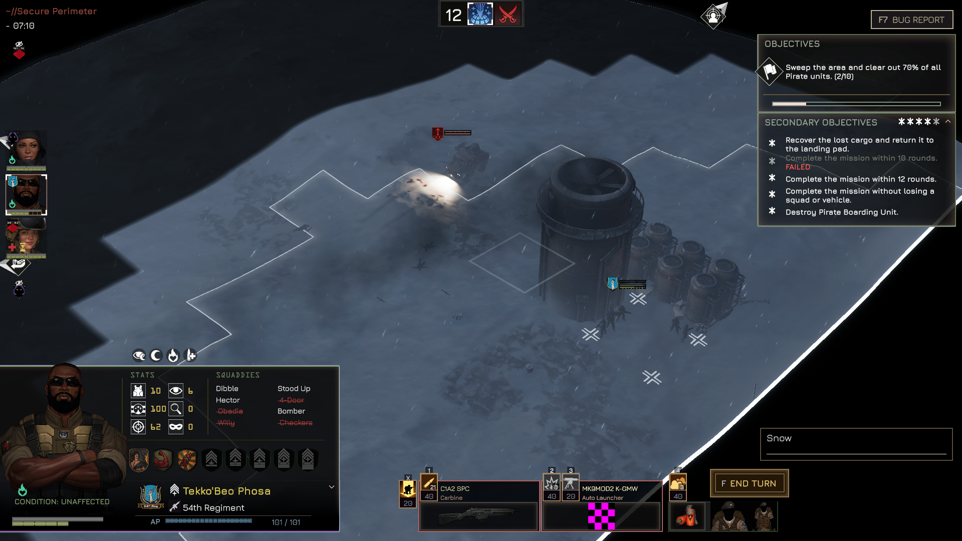 In addition to managing their human flaws, you’ll need to kit out your squads with new gear to best escalating threats. But Menace’s economy is sheer. A new set of rifles for a single squad can cost you all the booty you picked up from last mission. You can stockpile goods for big purchases, but that will leave your troops worse off right now. Early on, I realized I had no means of repairing my lone troop transport, which had become seriously damaged in a few skirmishes. I needed its firepower, but sending it out risked its destruction and the loss of my only vehicle. I equipped it with a new grenade launcher, thinking I could keep it out of range of enemy attacks. This proved effective, until it did not. My own troop transport stood in a smoldering heap. I could not afford a new one. All these small decisions move together to induce a delicious fear. Menace has tactics with real stakes, but that doesn’t mean there aren’t places for improvement.