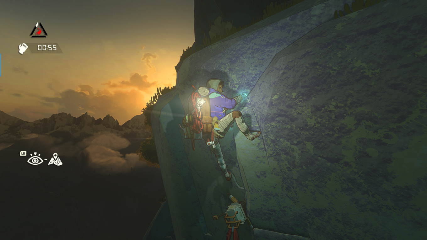Climbing isn’t the only focus, though. You’ll need to seek out sources of water to keep your bottles topped up and cook food in your bivouac, regularly check in on the condition of your hands and assess if more tape is needed, and manage your backpack (within which items tumble about freely and must be shaken up to make space – a refreshing change from the usual grid system). You’ll meet a few other characters along the way, too, but it’s best to avoid spoilers there.
