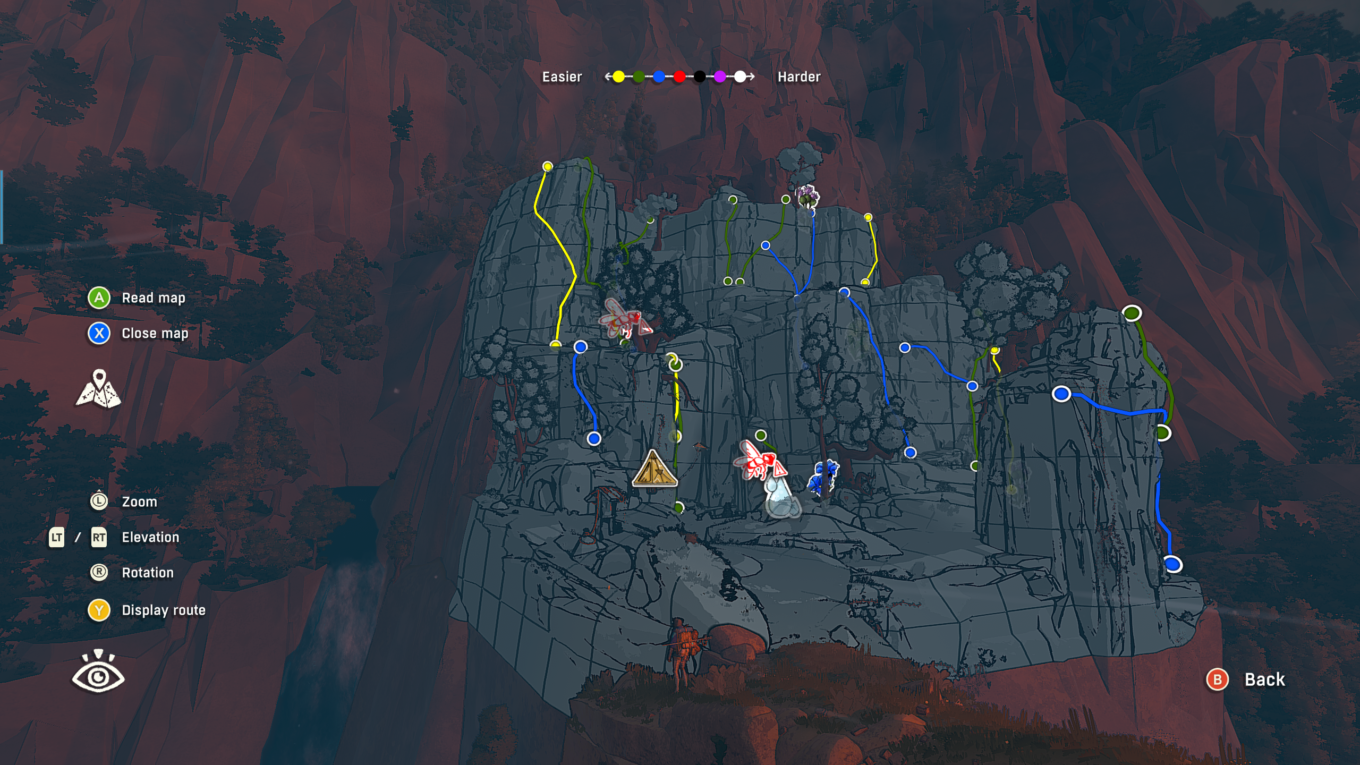 As the range of options available to you becomes clear, Cairn starts to feel like an unusually generous sandbox. This is underscored by the fact that Kami is rendered in its entirety from the off (a particularly lovely touch is that you can switch to a route view at any point and see your whole path) and that every portion offers a range of routes at varying difficulties. You can curate your own experience, even shortcutting some of the climbing by trekking at points – though this usually comes at the cost of taking a less direct route, and Aava has to lug a heavy backpack so can’t run for long.
