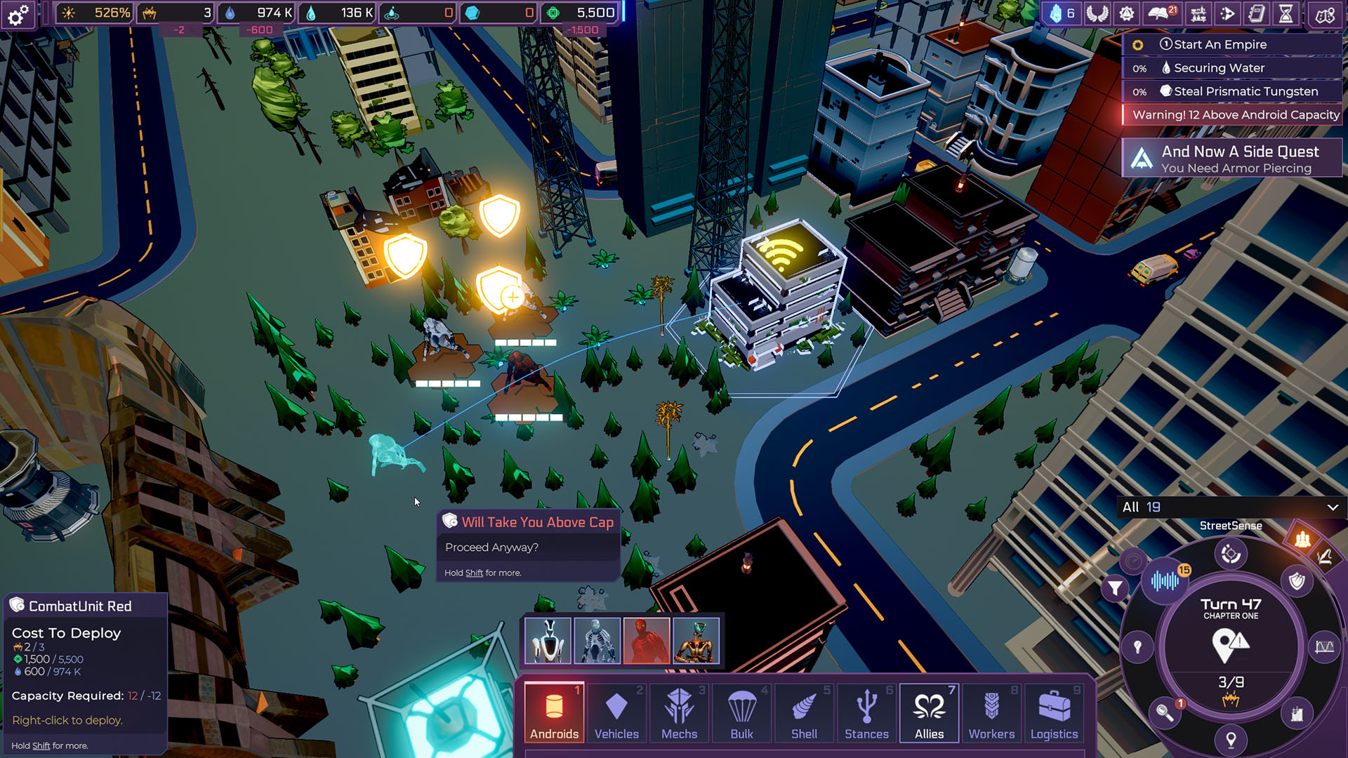 You manage all of this, turn-by-turn, without any particular automation early on, but it never becomes overwhelming thanks to a smart UI that always seems to offer three ways to achieve any particular task. You can zoom right down to street level and individual units, positioning them on top of buildings for a combat advantage – zoomed-in encounters that make the game feel like a mini X-Com – or instigating conversations with NPCs. But then roll right back up to the map view and see the entire city and all the units and buildings you have active within it. You can navigate and issue commands from any level, and all of this information can be further sliced and diced by switching between different customisable lenses which highlight different aspects of the vast world playing out below you.