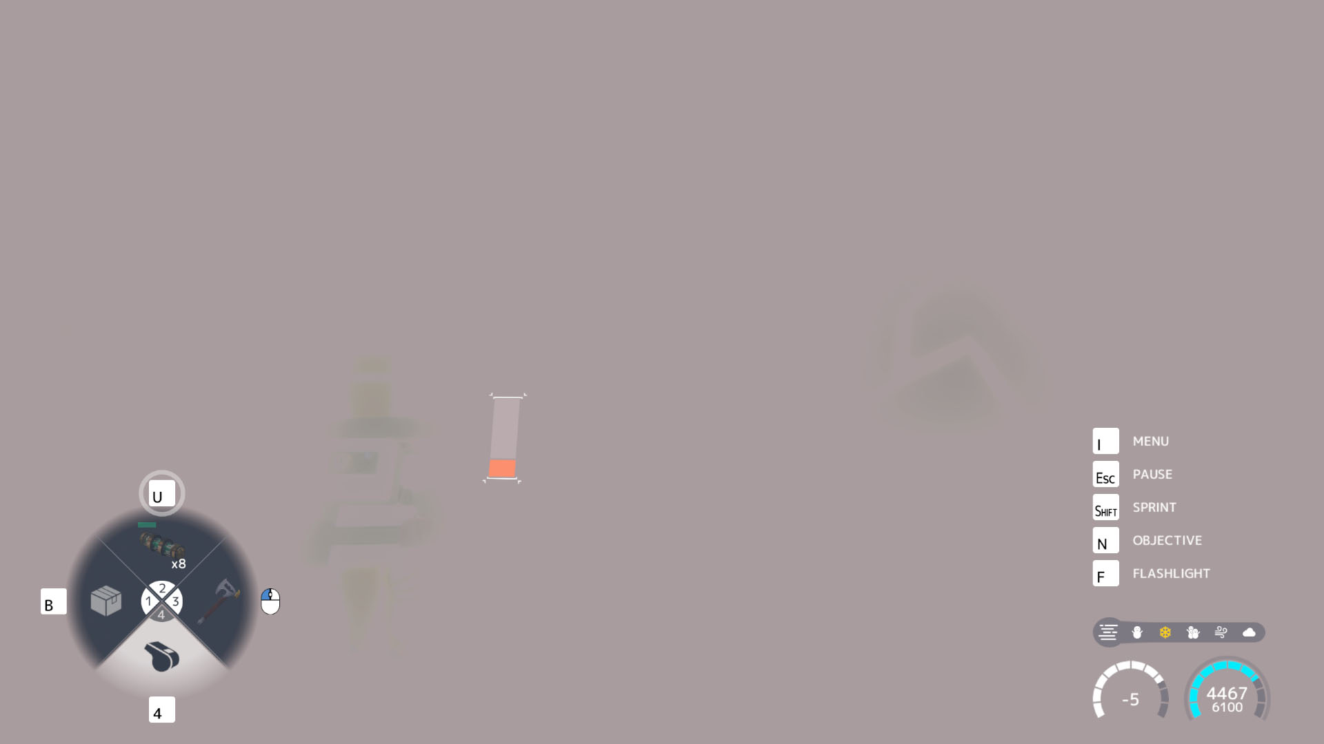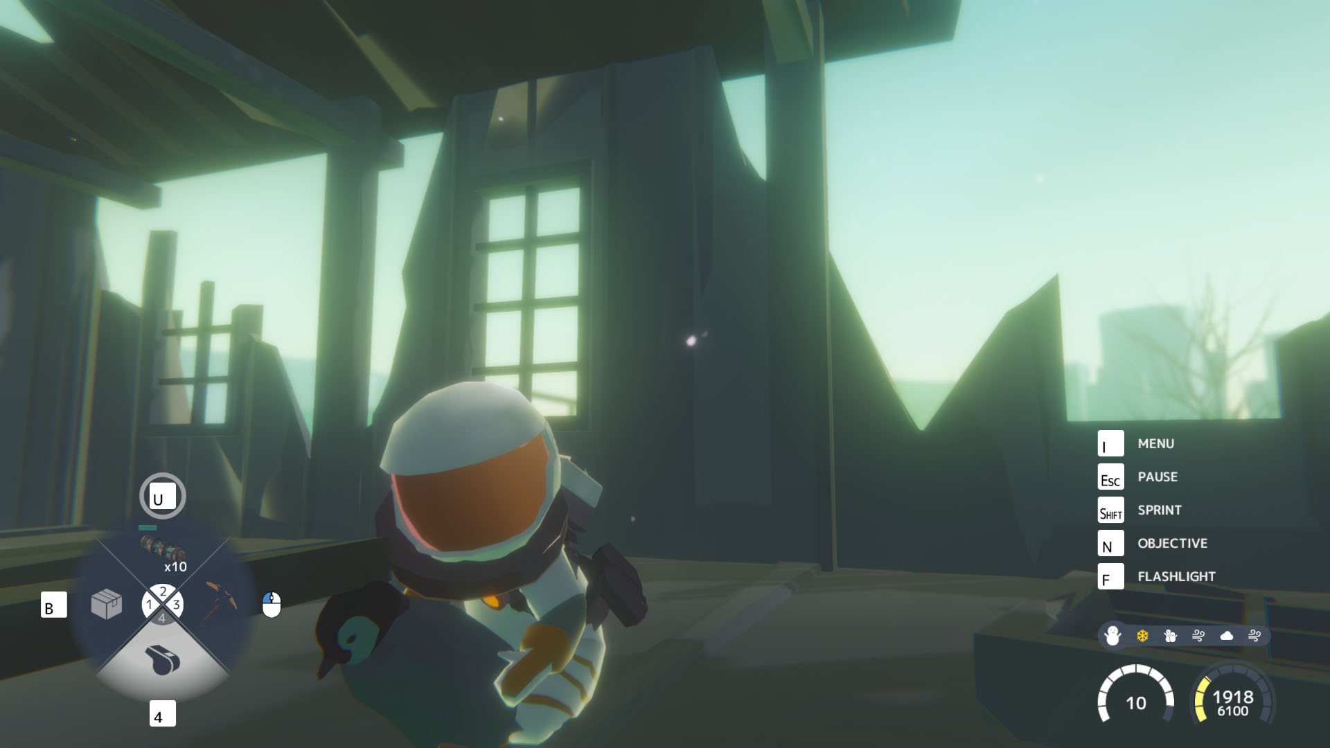 Your upgradeable suit and backpack protect you from the worst of the cold, but constantly burn fuel to do so. The colder it gets, the faster your protection depletes, so it’s imperative that you craft fuel cells to top it up. You also start each level with a finite amount of cold resistance which reduces this consumption, but is itself drained by the cold. You can recharge it in the warm, but you’ll be a few stages in before that becomes a realistic prospect. Heat is very hard to come by.