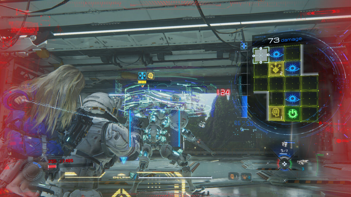 Which is where Diana comes in, offering to help by lending her hacking skills to the party. Hacking takes place on a grid which pops up when you aim at an enemy. The game doesn’t pause, and you must quickly navigate to a green EXE node using the face buttons (playing with a controller is recommended over mouse and keyboard, and works significantly better) which will temporarily open an enemy’s shell and expose weak points that flash orange when shot. Passing through blue ‘Open’ nodes on the grid stacks damage and exposure time, but requires a more circuitous route, and you must do all of this while dodging incoming attacks and keeping your intended target in view (the grid will disappear if you don’t, but your progress will still be there when you aim again, and only resets if you take a hit).